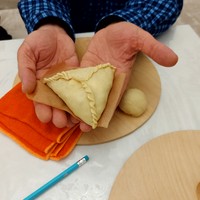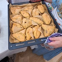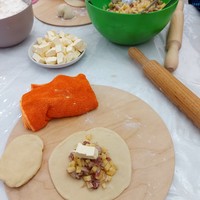 Нас встретили, всё очень красиво, милейшая хозяйка проводила помыть руки и надеть фартуки с головными уборами, под её чутким руководством мы сделали свои первые эчпочмаки, и у нас получилось даже лучше, чем просто сносно)), все это перемежалось, чередовалось разговорами, обсуждениями начинок, рецептов, историй, казусов и много другого, что весь вечер было ощущение, что мы давным-давно хорошо знакомы и просто пришли в гости, или даже к родным, вместе готовим, что-то делаем.